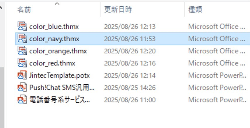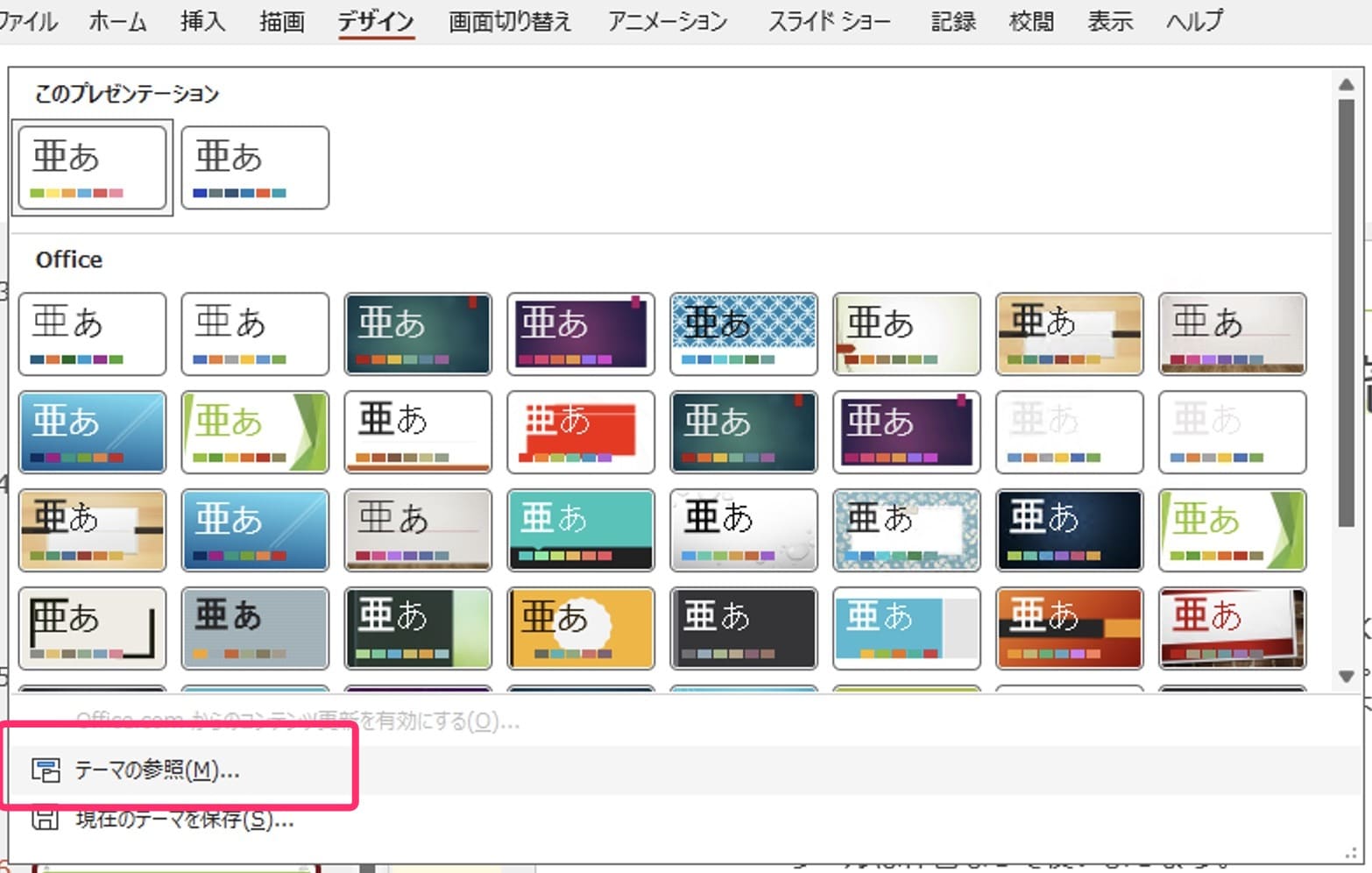 [デザイン] タブ → [テーマ] の右側の「▼」→「テーマの参照」をクリック